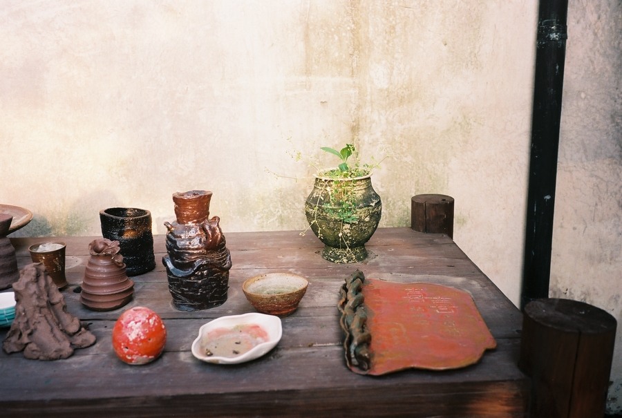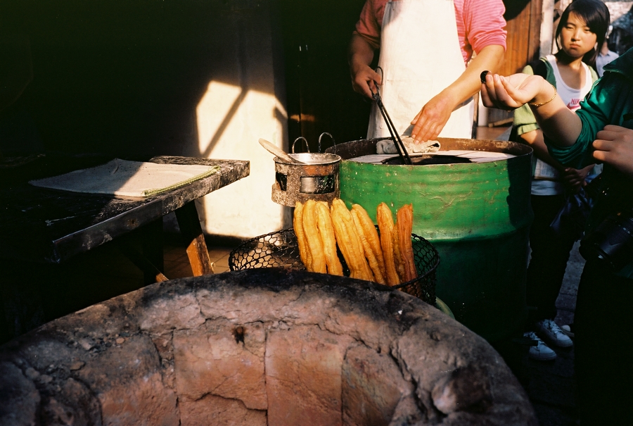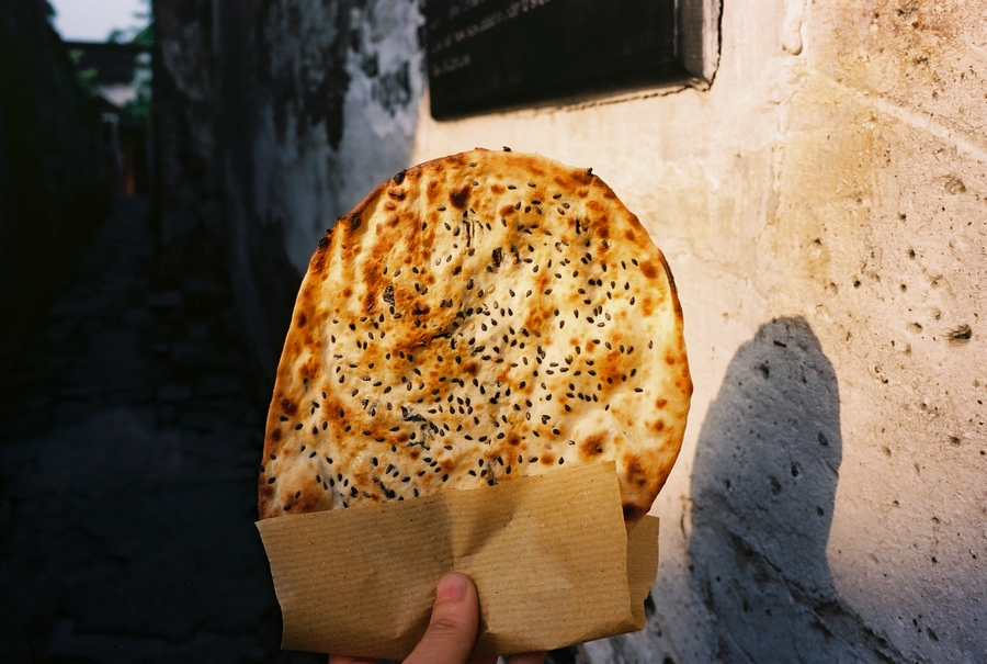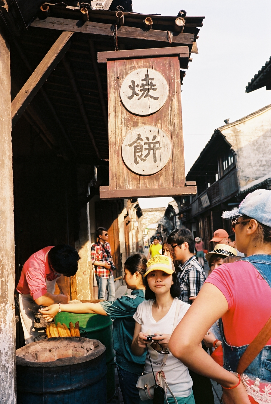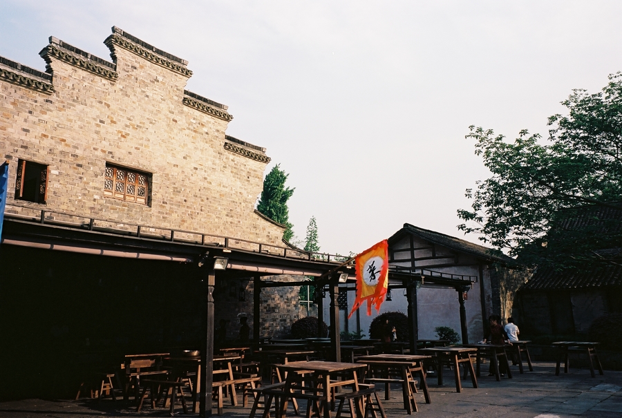 一个人出游,可以很自由,想吃什么就吃什么,想停留多久就停留多久,想起多早就起多早。在民宿办理入住后,穿上当地的蓝色碎花拖鞋,背着我的那台口袋机Klasse W从街头走到街尾,跟随在来写生的艺术系大学生人群中,排队买个刚出炉的乌镇烧饼,香浓的黑芝麻粘在薄薄酥脆的面皮上,咬在嘴里就想咬下一口。不过呢,我的肠胃有点不争气,好在整个西栅公共厕所那是相当发达,每个厕所都装有空调,还是水景实木厕所。